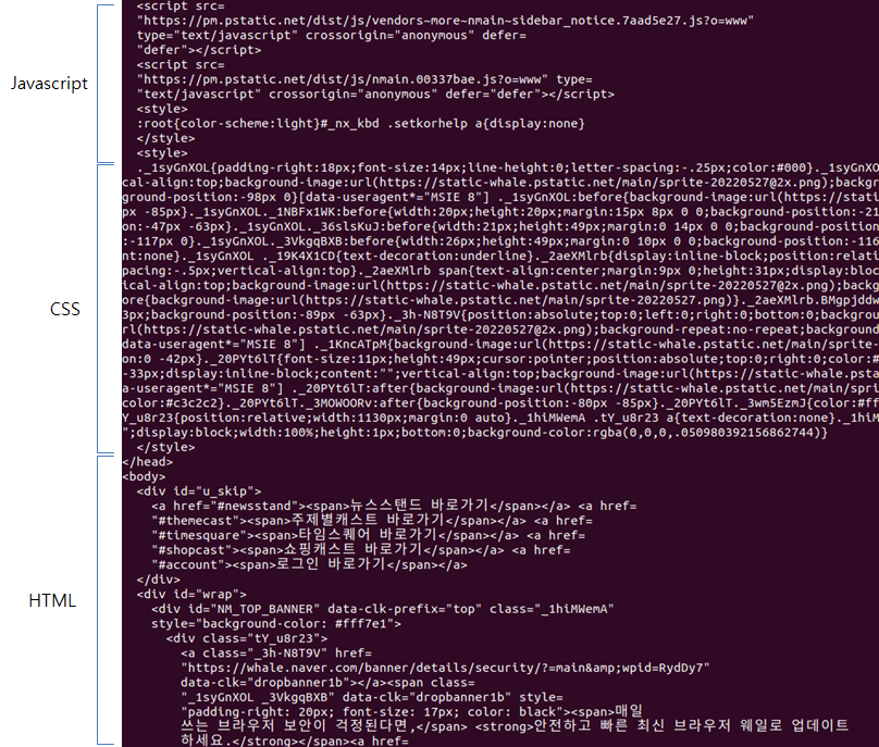 실제 네이버 홈페이지에 접속해 응답받은 파일을 보면 HTML, CSS, Javscript로 구성되어 있다.