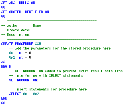위 소스코드는 @p1, @p2 두 개의 매개 변수를 입력받은 후, 매개 변수의 값을 출력하는 저장 프로시저의 생성 코드입니다.