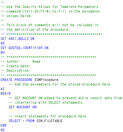 위 소스는 이전 장에 만들었던 FILE TABLE의 전체 내용을 출력하는 'SELECT * FROM SSM_FILETABLE' 쿼리를 질의하는 저장 프로시저를 SSMProcedure 이름으로 생성하는 스크립트입니다.