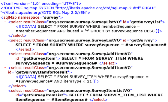 위 화면은 MyBatis에서 사용하는 XML 일부분입니다. MyBatis는 SQL문을 소스코드와는 별개인 XML 파일로 관리해서 전체적인 가독성 높아집니다. 또한, SQL 문이 소스코드에 종속되지 않기 때문에 재사용이 쉬우며 프레임워크 자체에서 제공하는 보안과 기타 편리한 기능을 제공 받을 수 있습니다.