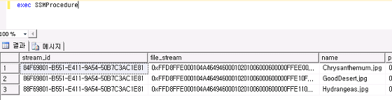 위 소스는 이전 장에 만들었던 FILE TABLE의 전체 내용을 출력하는 'SELECT * FROM SSM_FILETABLE' 쿼리를 질의하는 저장 프로시저를 SSMProcedure 이름으로 생성하는 스크립트입니다.