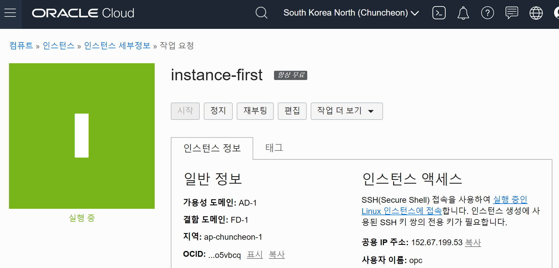 - username, public-ip-address 아래 그림을 보면 username은 opc이고 ip는 152.67.199.53 임을 알 수 있다.
