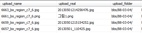 2번째 행의 데이터를 보면 사용자가 게시판에 업로드한 파일의 이름은 "그림1.png"이고 해당 파일은 웹서버의 "bbs/88-03-04/6661_bo_region_c7_6.png"에 저장되어 있습니다.