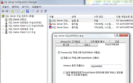 1) DBMS에서 FILESTREAM 사용 설정